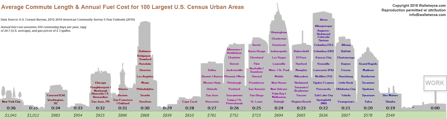 This study, which relies on data from the 2012-2016 American Community Survey for mean commute time, calculates fuel cost based on an analysis of rush-hour commute times and corresponding distances between multiple randomly-chosen locations. We also assume 250 commuting days per year, a U.S. average of 24.7 miles per gallon, and gasoline prices of $3.